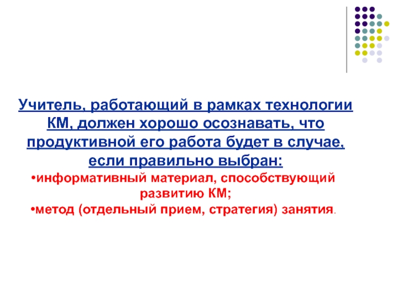 Слайд 5Учитель, работающий в рамках технологии КМ, должен хорошо осознавать, что продуктивной