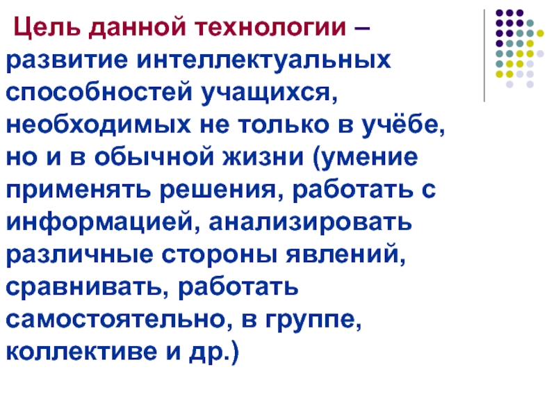 Слайд 29 Цель данной технологии – развитие интеллектуальных способностей учащихся, необходимых не