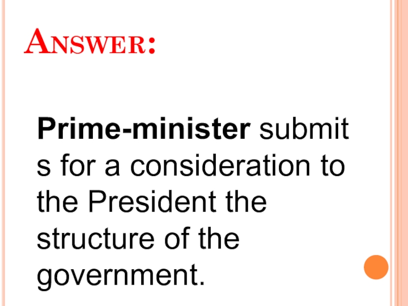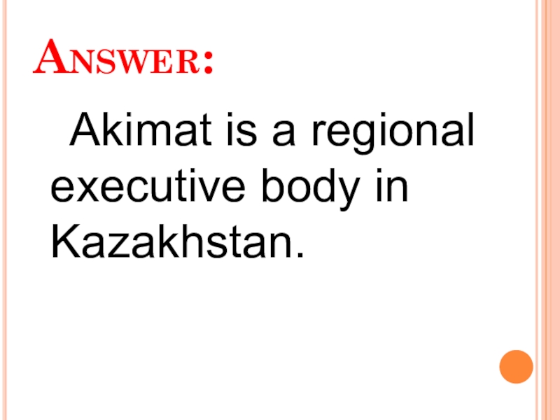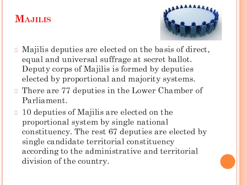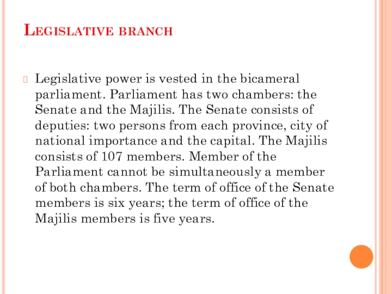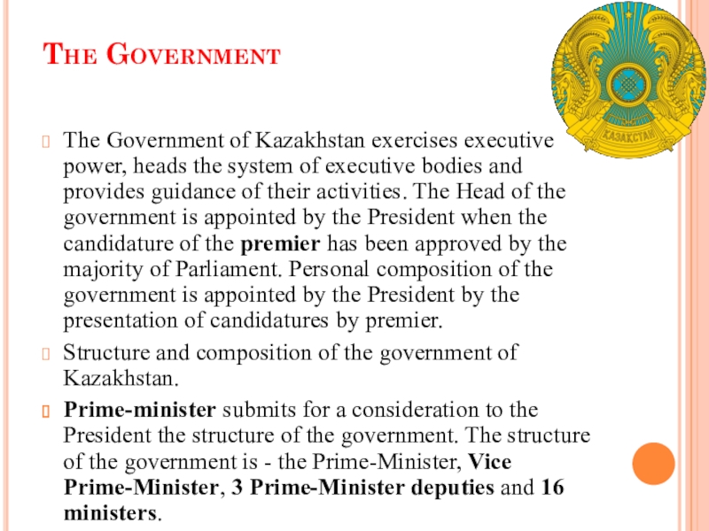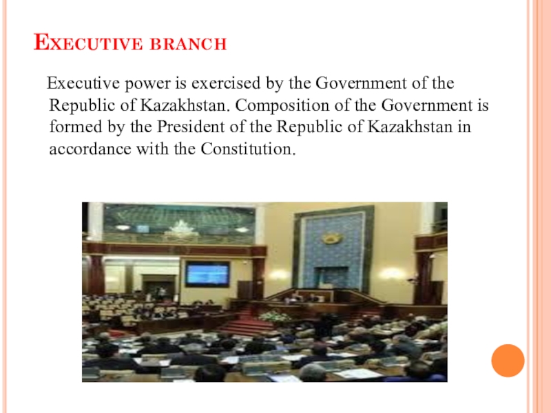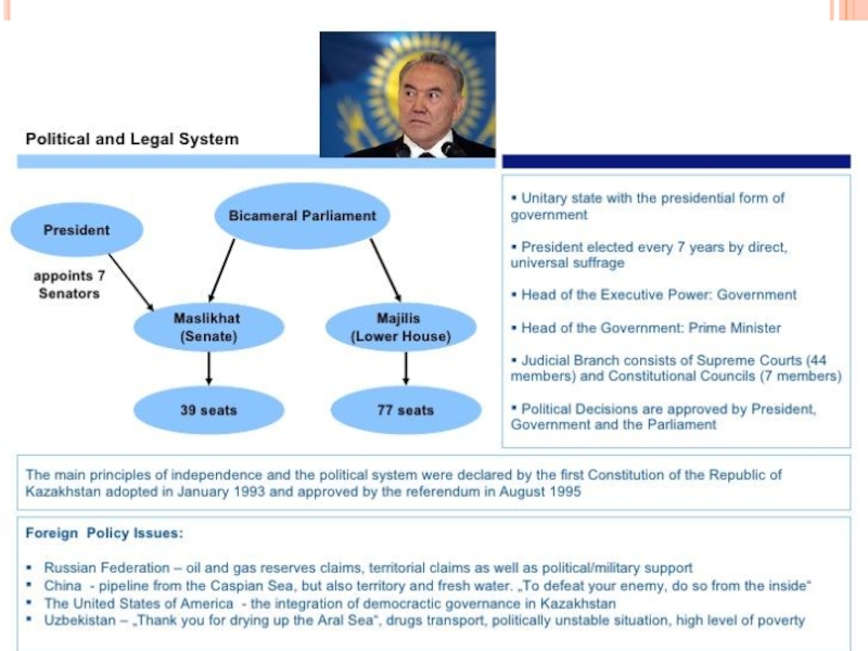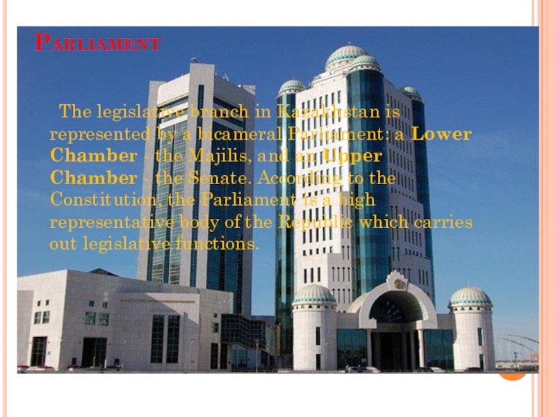 According to the Constitution, adopted at the national referendum on August 30, 1995, the Republic of Kazakhstan is a unitary state with a presidential form of government, which has three independent branches: executive, legislative and judicial.
