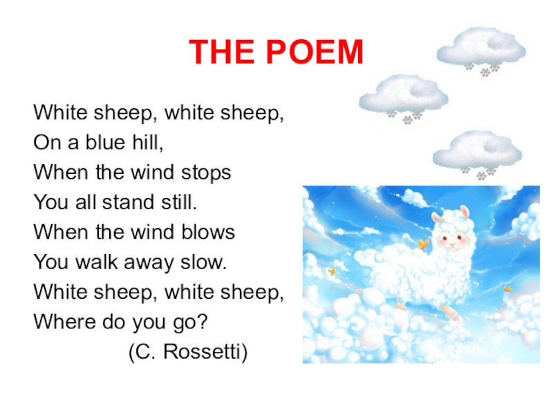 THE POEMWhite sheep, white sheep,On a blue hill,When the wind stopsYou all stand still.When the wind blowsYou walk away slow.White sheep, white sheep,Where do you go? (C. Rossetti)
