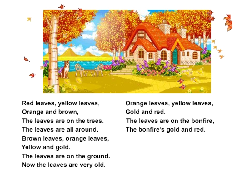 Red leaves, yellow leaves,        Orange leaves, yellow leaves,
