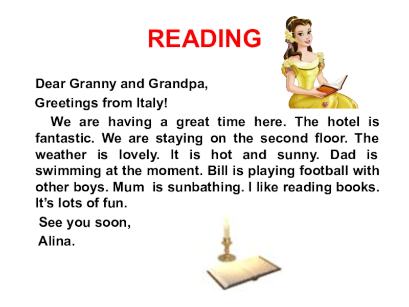 READING  Dear Granny and Grandpa,  Greetings from Italy!  We are having a great time