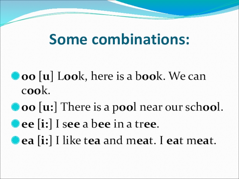 Some combinations:oo [u] Look, here is a book. We can cook.oo [u:] There is a pool near