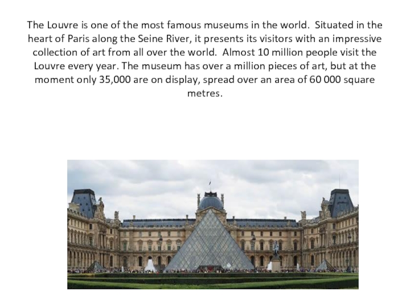 world. Situated in the heart of Paris along the Seine River, it presents its visitors with an impressive collection of art from all over the world. Almost 10 million people visit the Louvre every year. The museum has over a million pieces of art, but at the moment only 35,000 are on display, spread over an area of 60 000 square metres.