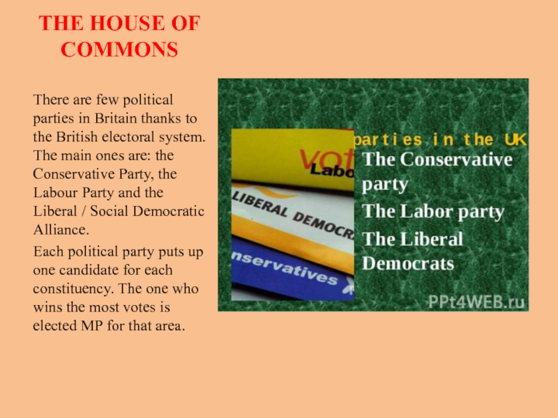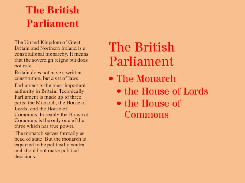 Parliament is the most important authority in Britain. Technically Parliament is made up of three parts: the Monarch, the House of Lords; and the House of Commons. In reality the House of Commons is the only one of the three which has true power.