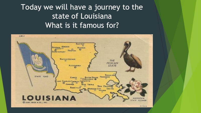 Слайд 2Today we will have a journey to the state of Louisiana What