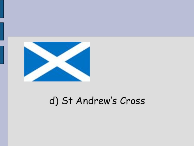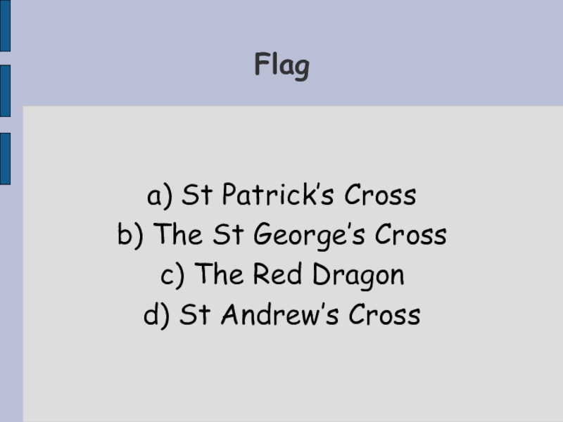 a) St Patrick’s Cross b) The St George’s Crossc) The Red Dragond) St Andrew’s CrossFlag