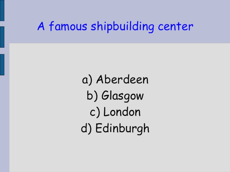 A famous shipbuilding centera) Aberdeenb) Glasgowc) London d) Edinburgh