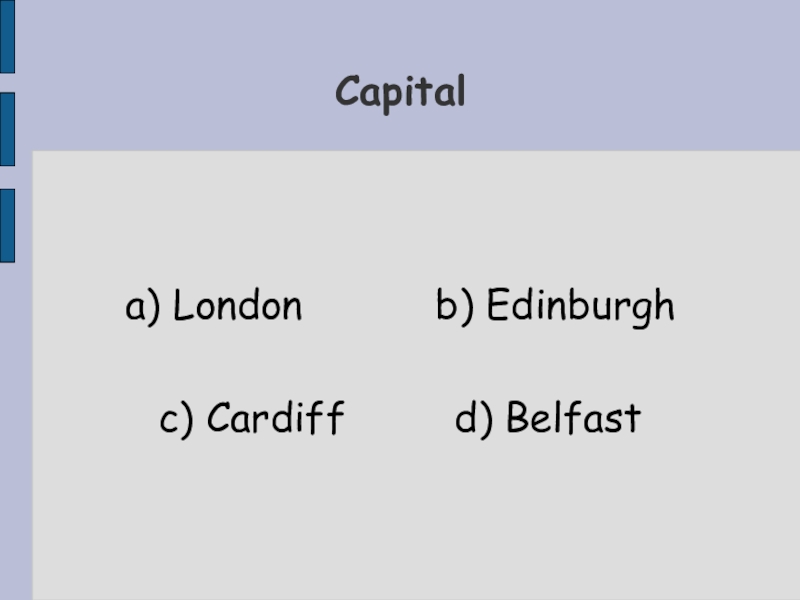 a) London      b) Edinburghc) Cardiff     d) BelfastCapital