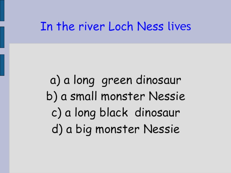 In the river Loch Ness lives a) a long green dinosaurb) a small monster Nessiec) a long