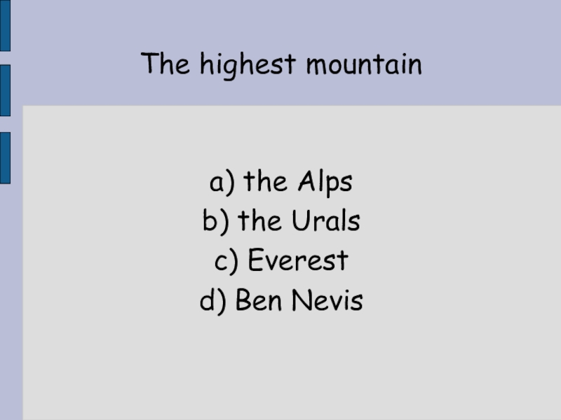 a) the Alpsb) the Uralsc) Everest  d) Ben NevisThe highest mountain
