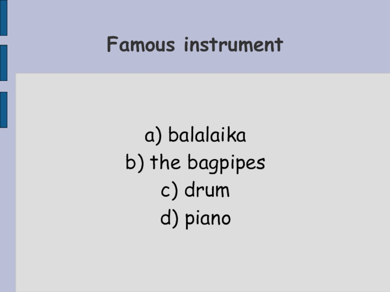 a) balalaikab) the bagpipesc) drumd) pianoFamous instrument