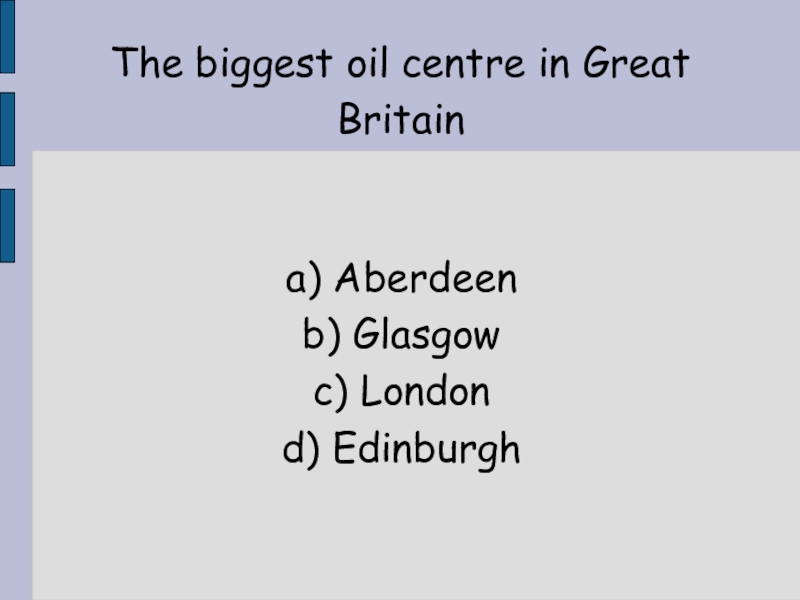 The biggest oil centre in Great Britaina) Aberdeenb) Glasgowc) London d) Edinburgh