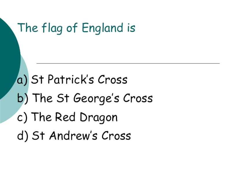 The flag of England isa) St Patrick’s Cross b) The St George’s Crossc) The Red Dragond) St