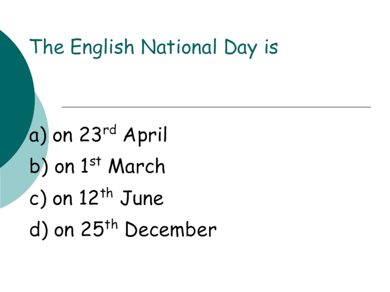 The English National Day isa) on 23rd April    b) on 1st Marchc) on 12th