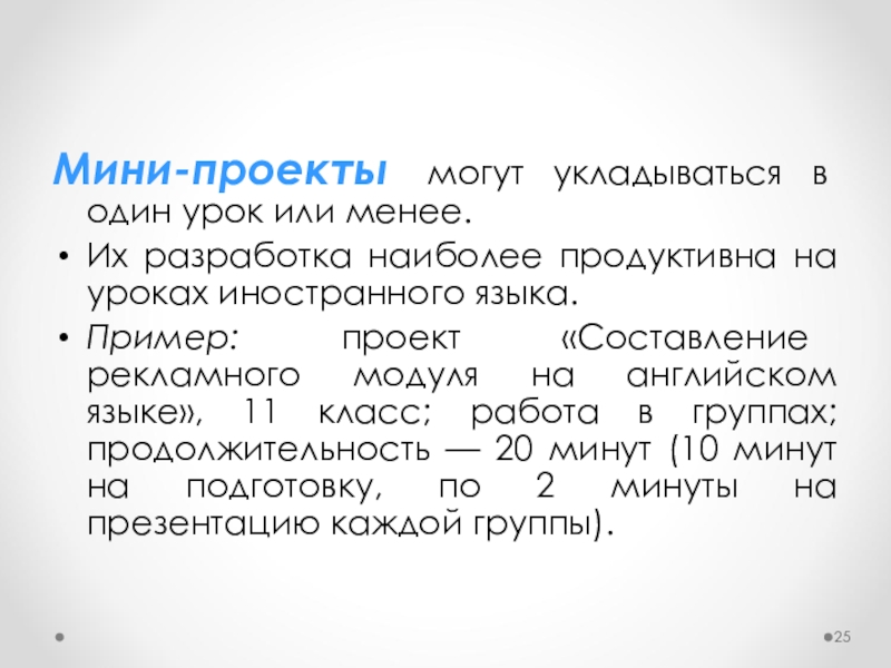 Пример: проект «Составление рекламного модуля на английском языке», 11 класс; работа в группах; продолжительность — 20 минут (10 минут на подготовку, по 2 минуты на презентацию каждой группы).