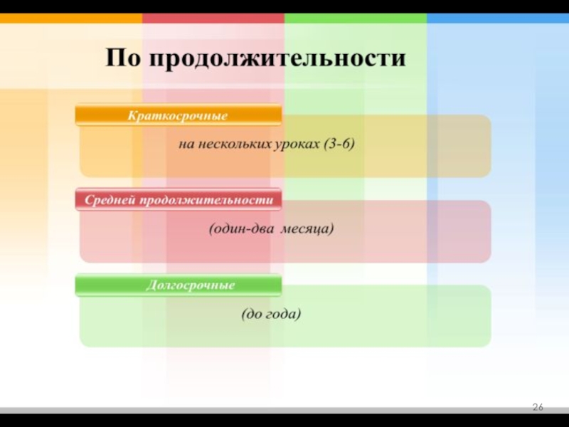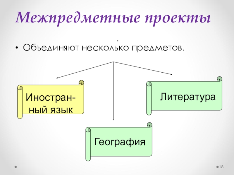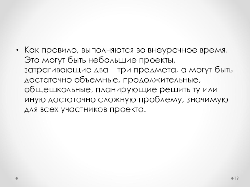 затрагивающие два – три предмета, а могут быть достаточно объемные, продолжительные, общешкольные, планирующие решить ту или иную достаточно сложную проблему, значимую для всех участников проекта.