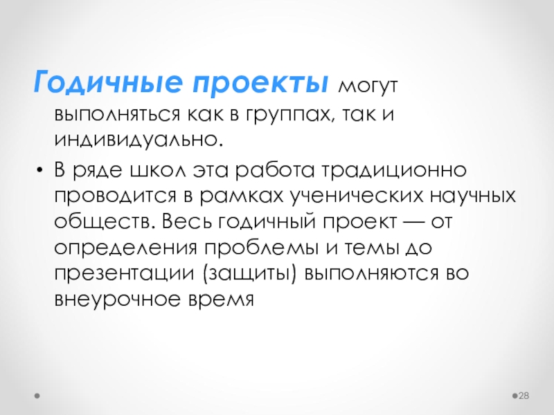 школ эта работа традиционно проводится в рамках ученических научных обществ. Весь годичный проект — от определения проблемы и темы до презентации (защиты) выполняются во внеурочное время