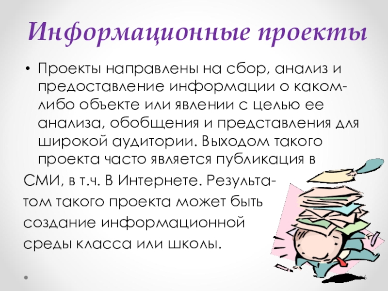 каком-либо объекте или явлении с целью ее анализа, обобщения и представления для широкой аудитории. Выходом такого проекта часто является публикация в