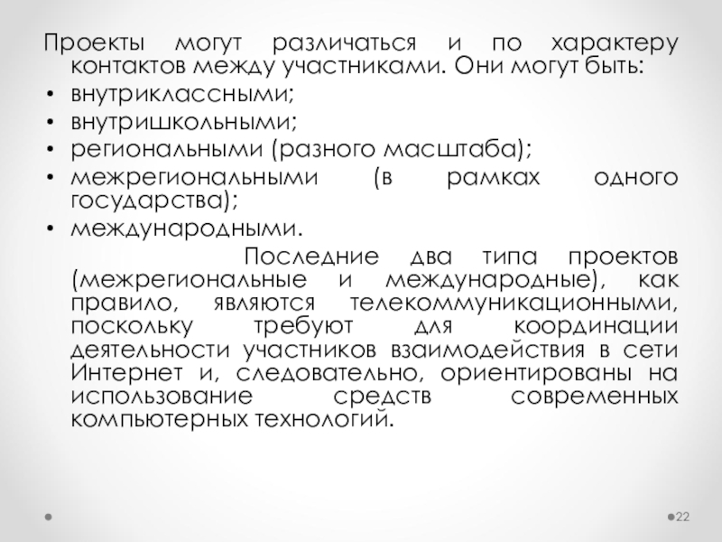 Последние два типа проектов (межрегиональные и международные), как правило, являются телекоммуникационными, поскольку требуют для координации деятельности участников взаимодействия в сети Интернет и, следовательно, ориентированы на использование средств современных компьютерных технологий.