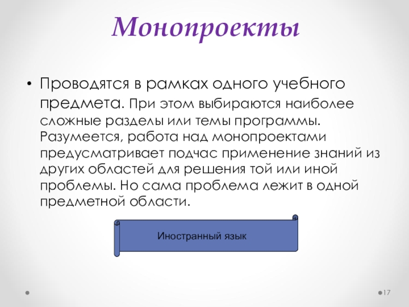 разделы или темы программы. Разумеется, работа над монопроектами предусматривает подчас применение знаний из других областей для решения той или иной проблемы. Но сама проблема лежит в одной предметной области.