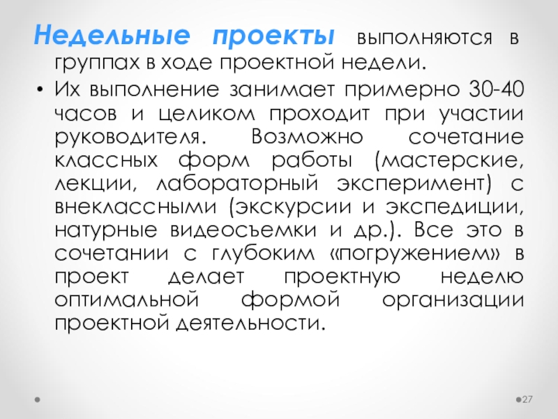 примерно 30-40 часов и целиком проходит при участии руководителя. Возможно сочетание классных форм работы (мастерские, лекции, лабораторный эксперимент) с внеклассными (экскурсии и экспедиции, натурные видеосъемки и др.). Все это в сочетании с глубоким «погружением» в проект делает проектную неделю оптимальной формой организации проектной деятельности.