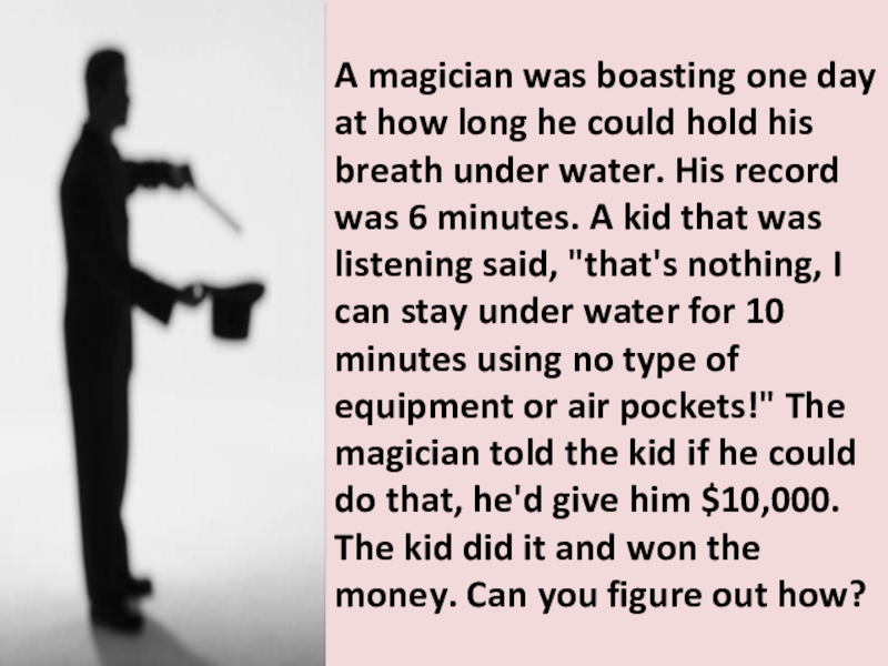 hold his breath under water. His record was 6 minutes. A kid that was listening said, "that's nothing, I can stay under water for 10 minutes using no type of equipment or air pockets!" The magician told the kid if he could do that, he'd give him $10,000. The kid did it and won the money. Can you figure out how?