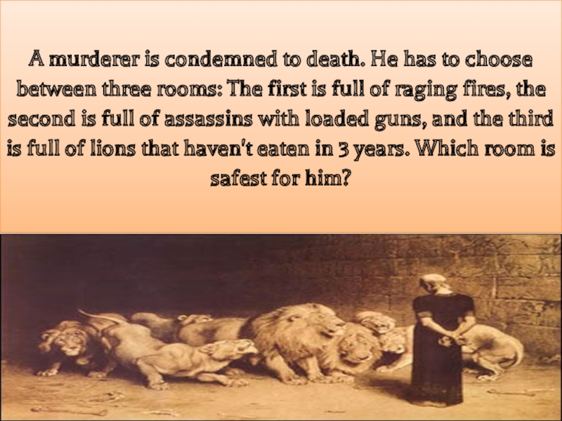 A murderer is condemned to death. He has to choose between three rooms: The first is full of raging fires, the second is full of assassins with loaded guns, and the third is full of lions