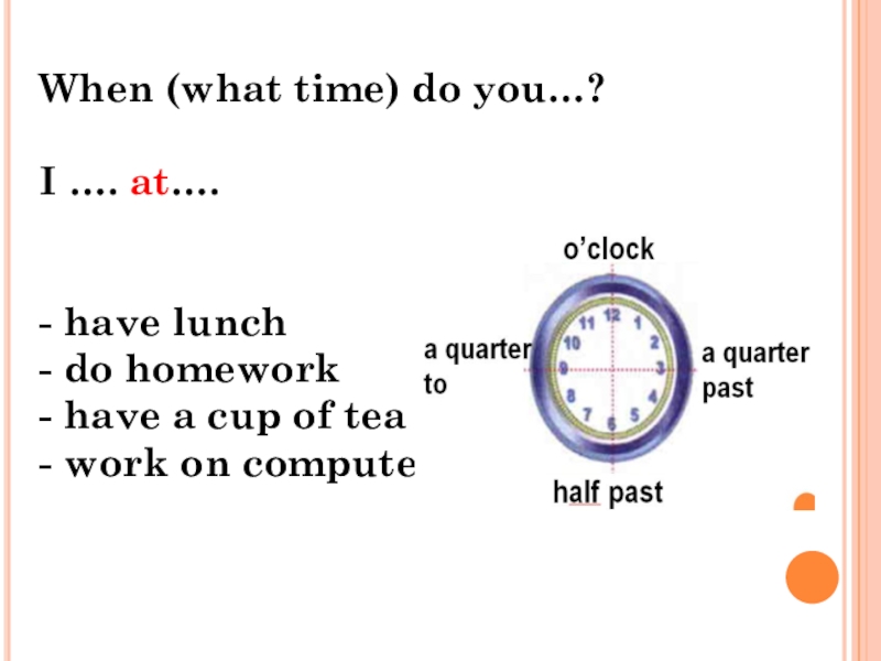 When (what time) do you…?I …. at….- have lunch- do homework- have a cup of tea- work
