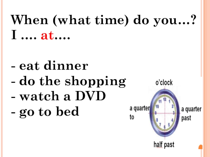 When (what time) do you…?I …. at….- eat dinner- do the shopping- watch a DVD- go to