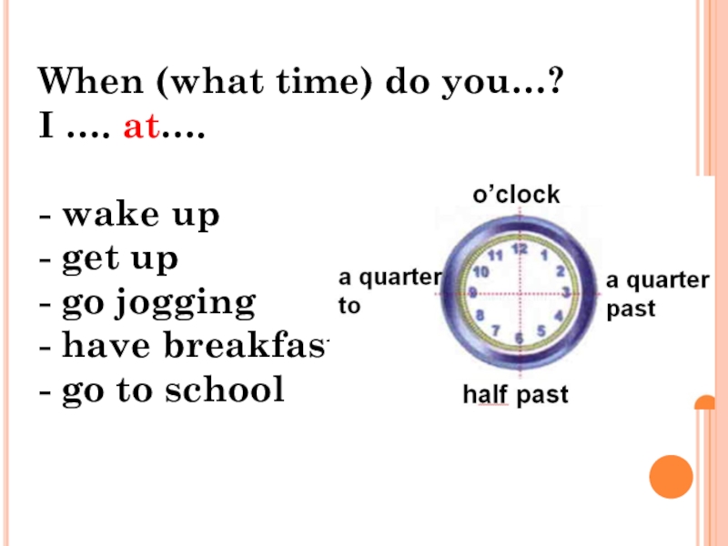 In the morning When (what time) do you…?I …. at…. - wake up- get up- go jogging-