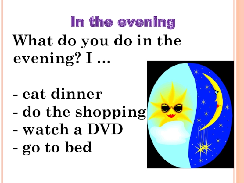In the evening What do you do in the evening? I …- eat dinner- do the shopping-