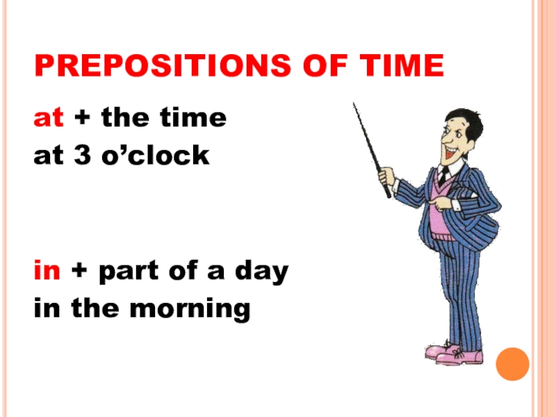 PREPOSITIONS OF TIMEat + the timeat 3 o’clockin + part of a dayin the morning