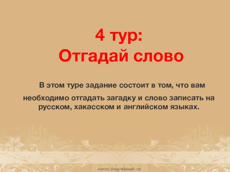 4 тур:  Отгадай слово  В этом туре задание состоит в том, что вам необходимо отгадать загадку