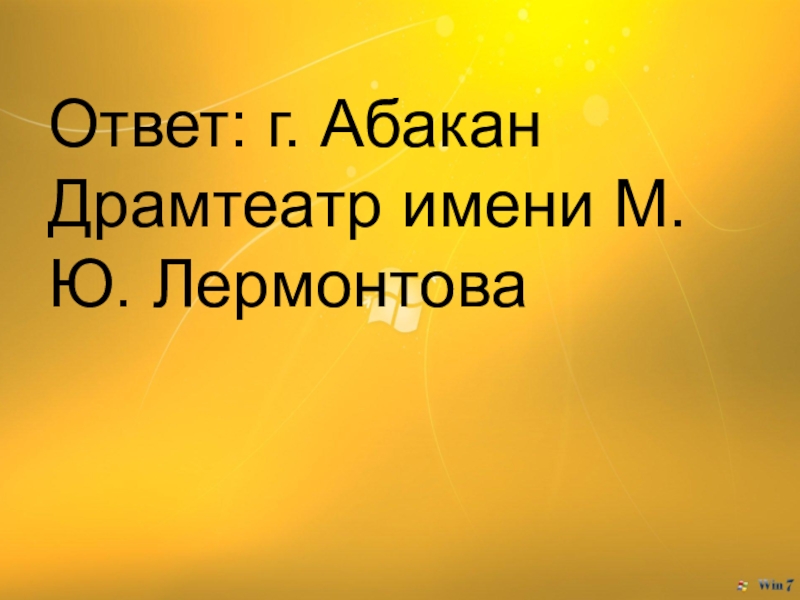 Слайд 9Ответ: г. Абакан Драмтеатр имени М.Ю. Лермонтова