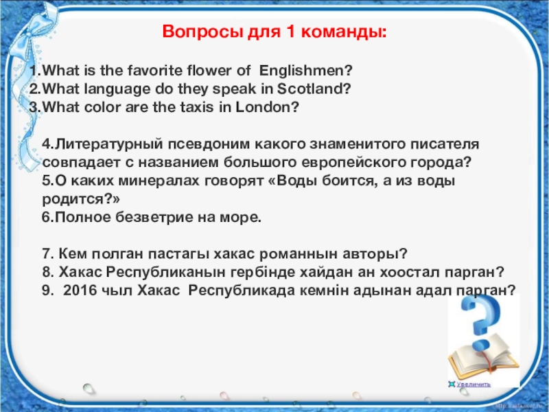 Вопросы для 1 команды: What is the favorite flower of  Englishmen? What language do they speak in