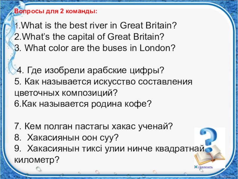 Вопросы для 2 команды:  1.What is the best river in Great Britain? 2.What’s the capital of