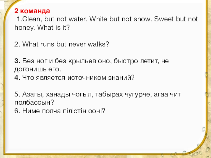 but not honey. What is it? 2. What runs but never walks? 3. Без ног и без крыльев оно, быстро летит, не догонишь его. 4. Что является источником знаний? 5. Азагы, ханады чогыл, табырах чугурче, агаа чит полбассын? 6. Ниме полча пiлiстiн оонi?