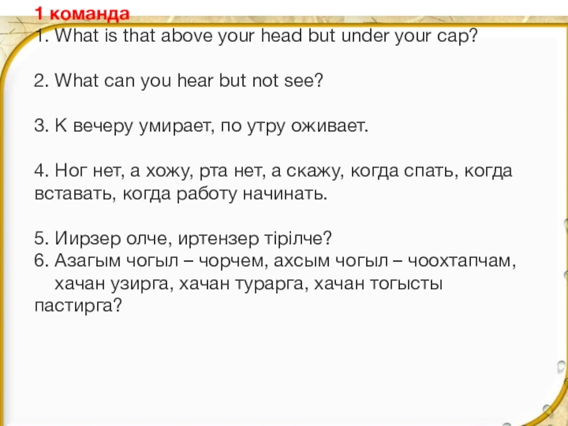 1 команда 1. What is that above your head but under your cap?   2. What