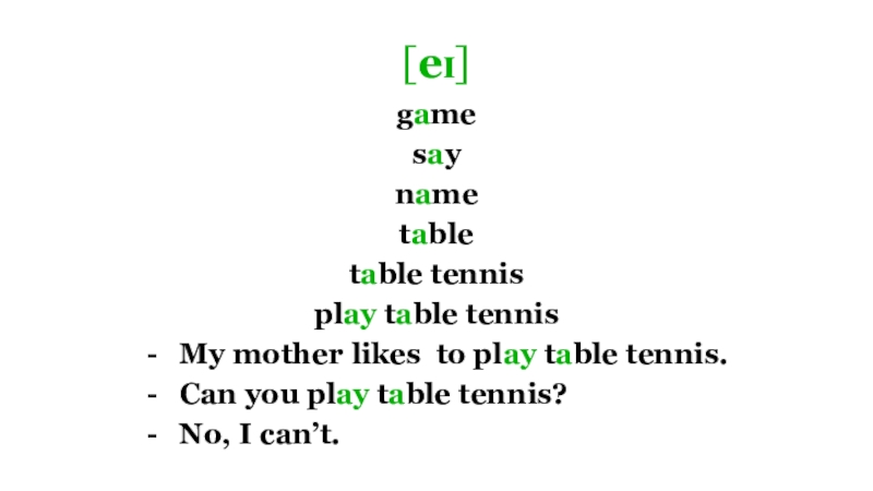 [eɪ]gamesaynametable table tennisplay table tennisMy mother likes to play table tennis.Can you play table tennis?No, I can’t.
