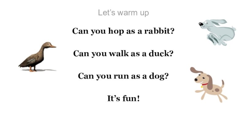 Let’s warm upCan you hop as a rabbit?Can you walk as a duck?Can you run as a dog?It’s fun!