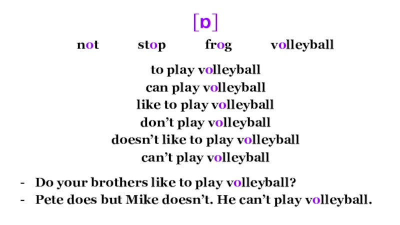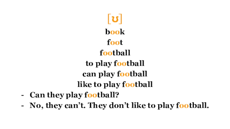 [ʊ]bookfoot footballto play footballcan play footballlike to play footballCan they play football?No, they can’t. They don’t like