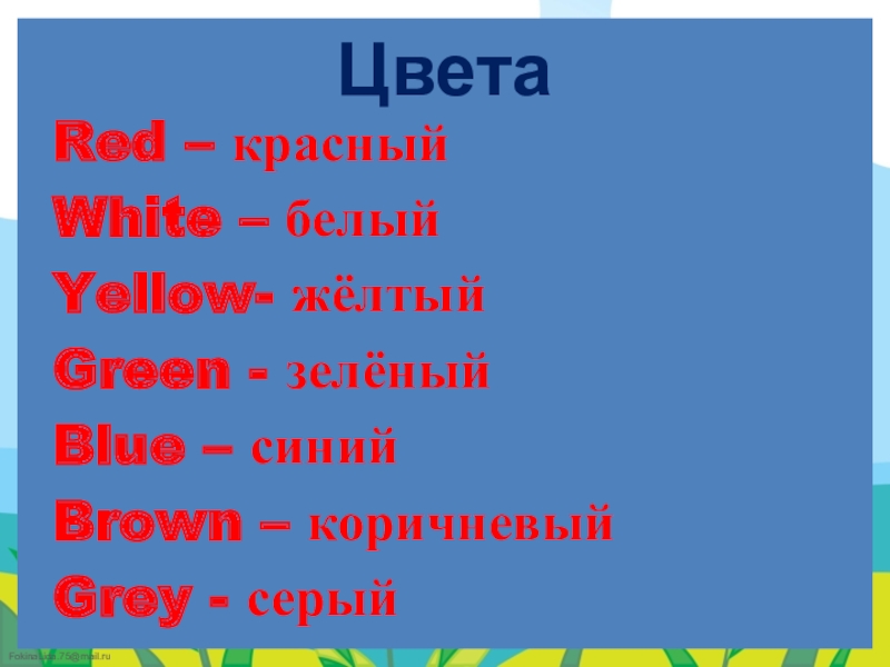 ЦветаRed – красныйWhite – белыйYellow- жёлтыйGreen - зелёныйBlue – синийBrown – коричневыйGrey - серый