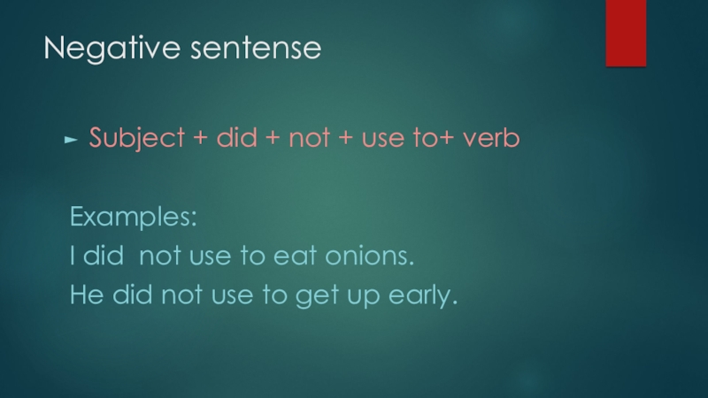 Negative sentenseSubject + did + not + use to+ verbExamples:I did not use to eat onions.He did