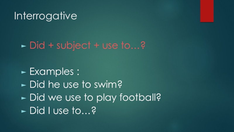 Interrogative Did + subject + use to…?Examples :Did he use to swim?Did we use to play football?Did