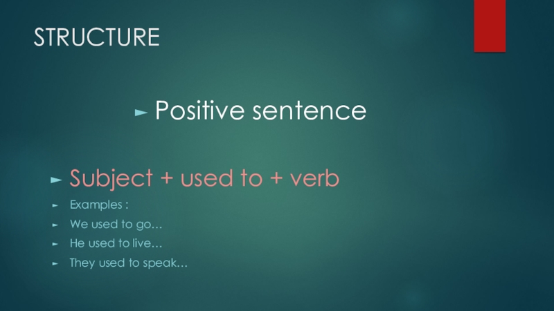 STRUCTUREPositive sentenceSubject + used to + verbExamples :We used to go…He used to live…They used to speak…