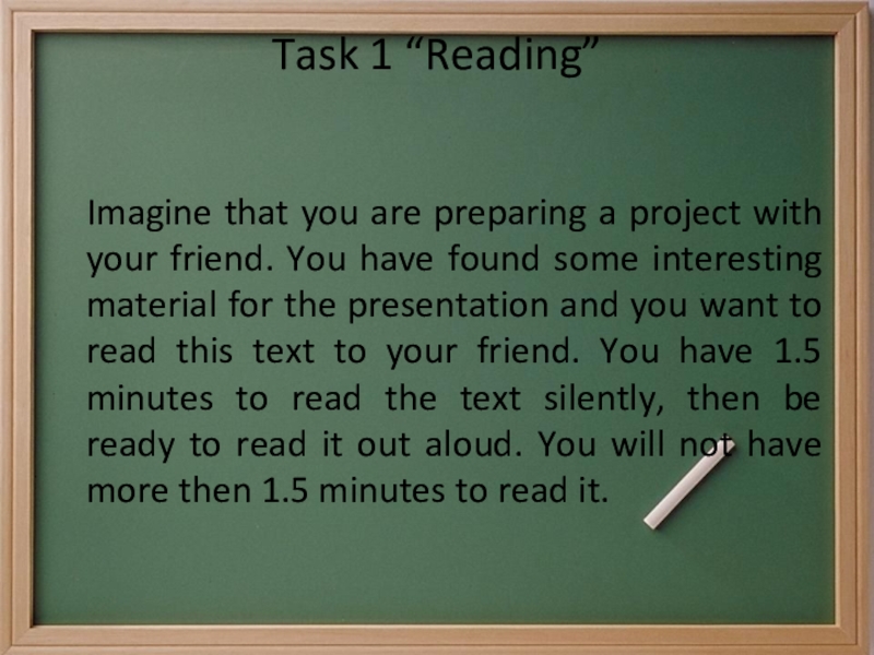 with your friend. You have found some interesting material for the presentation and you want to read this text to your friend. You have 1.5 minutes to read the text silently, then be ready to read it out aloud. You will not have more then 1.5 minutes to read it.