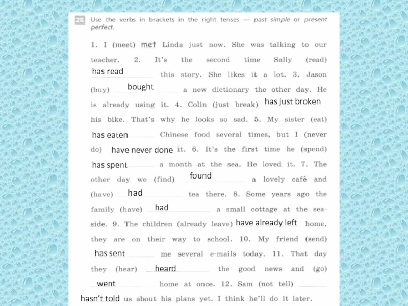 has readboughthas just brokenhas eatenhave never donehas spentfoundhadhadhave already lefthas sentheardwenthasn’t told