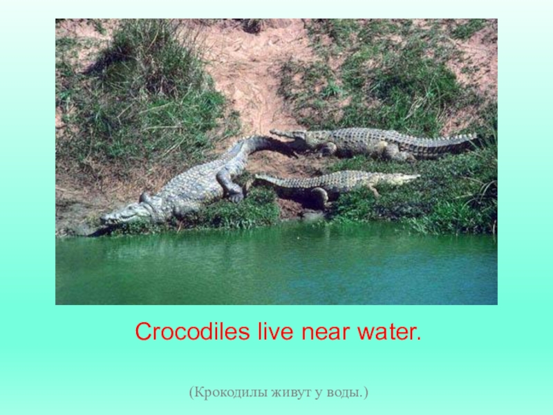 Слайд 5Crocodiles live near water.