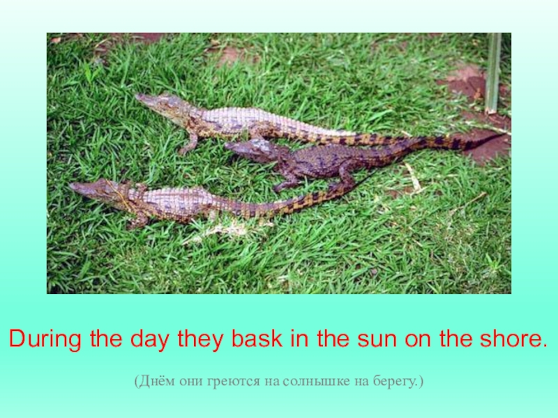 During the day they bask in the sun on the shore.(Днём они греются на солнышке на берегу.)